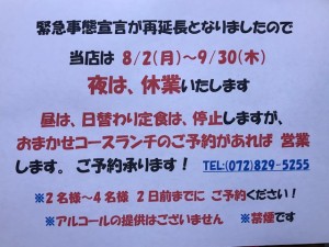緊急事態宣言が再延長となり 9/30(木)までの休業等のお知らせ