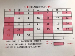 11/1(月)のランチは、所用有り お休みさせていただきますm(_ _)m