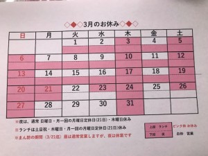 解除後は、夜は、日曜日・木曜日・月一回月曜日(第3 or 第4)がお休みです