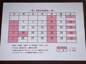 定休日:日曜日・木曜日・月一回月曜日(当月は、19日)